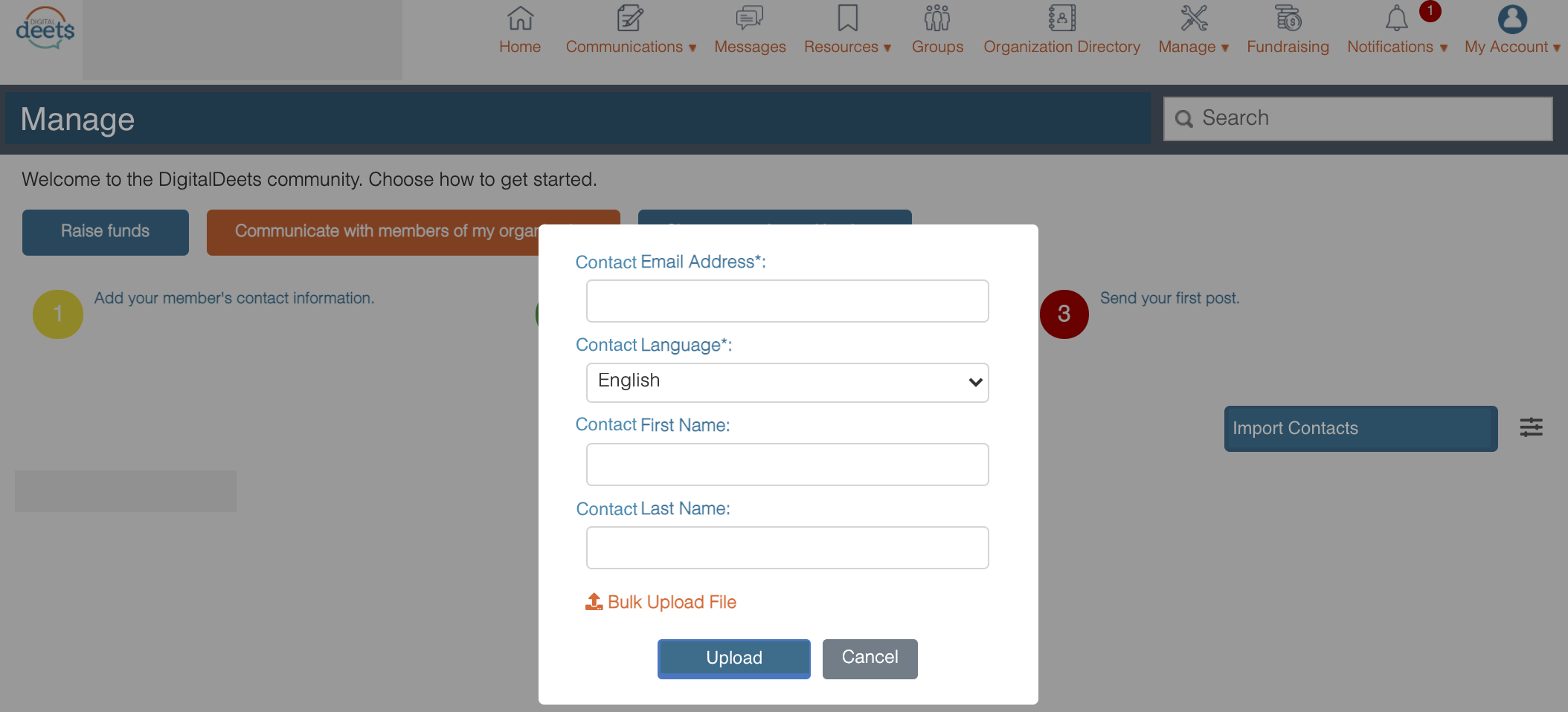 1. First, click on the text that says "Add your members' contact information." You can either add individually or bulk upload using a file.