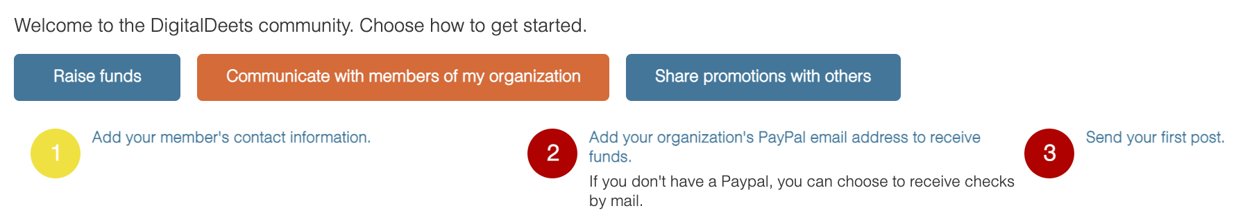 When you create your account and sign in, click on the Communicate with members of my organization blue box to see how to get started. You will see the numbered circles turn to green once you've completed each step.