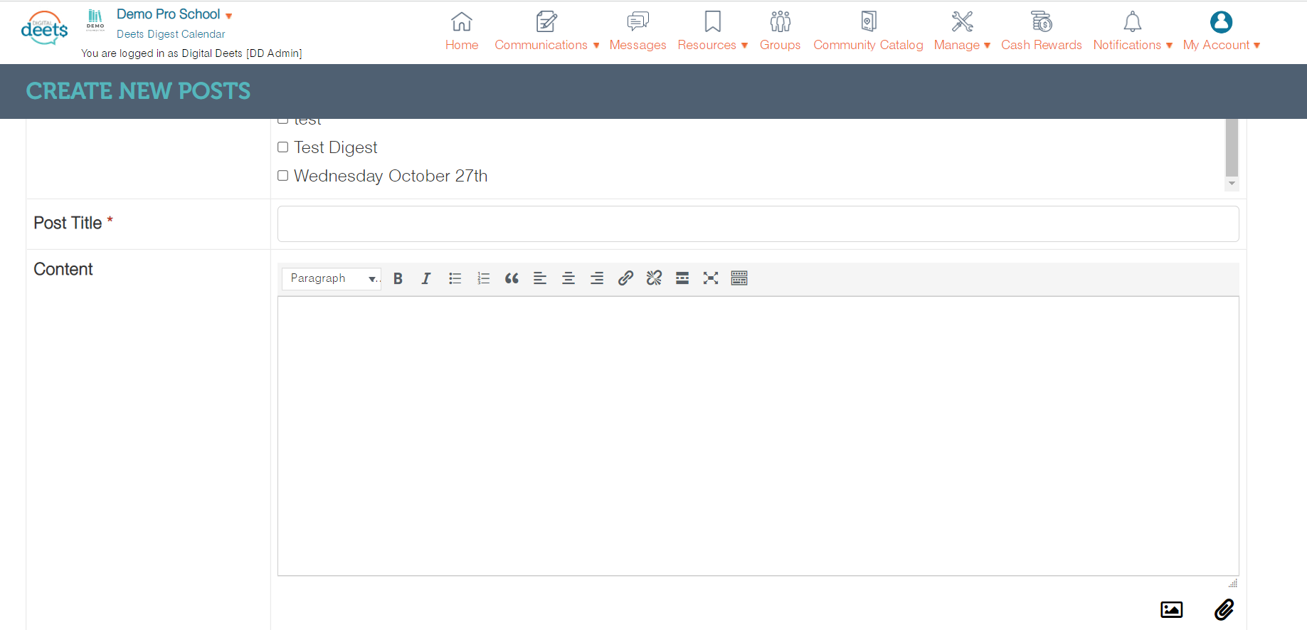 Fill in each field when you create your post. Attach up to 10 images or 1 file. Send your post immediately or schedule it for the future.