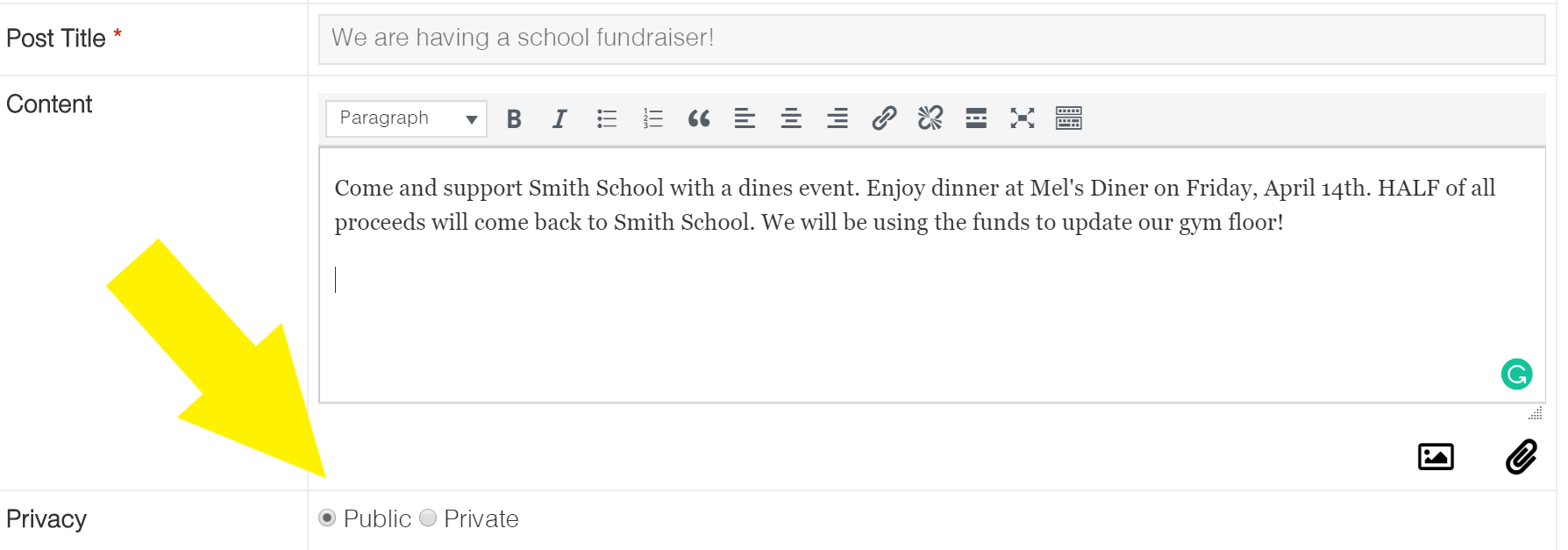 4. After you are satisfied with your post, you then have the option to choose if the post will be private or public. The post will automatically default to private. This means that the post will only be seen by your school's community members. If you choose public than your post will be seen on the public School Deets' feed. This feed will be on the School Deets' website and outside users will have the option to sign up to see specific school's posts.