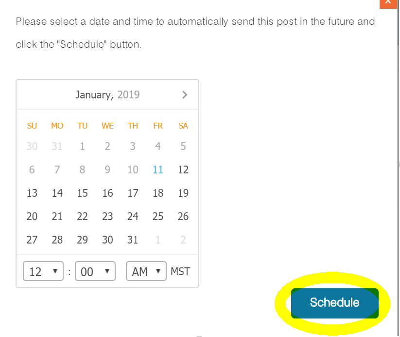 7. You are also able to schedule a message to be sent out for a later date. Once you pick a day and time, hit Schedule.
